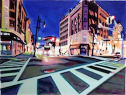 Vibrant street life, corner of Market & Main Street, City Hall, daytime crosswalk