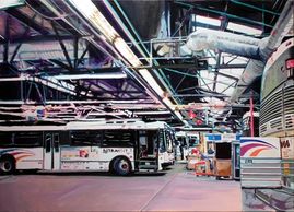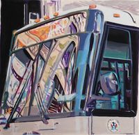 Referencing classical statuary, contemporary figures are painted as if carved of stone, Nine panels of porcelain enamel on steel hang in a stepped cascade, set into a recessed area to be filled with additional marble.
